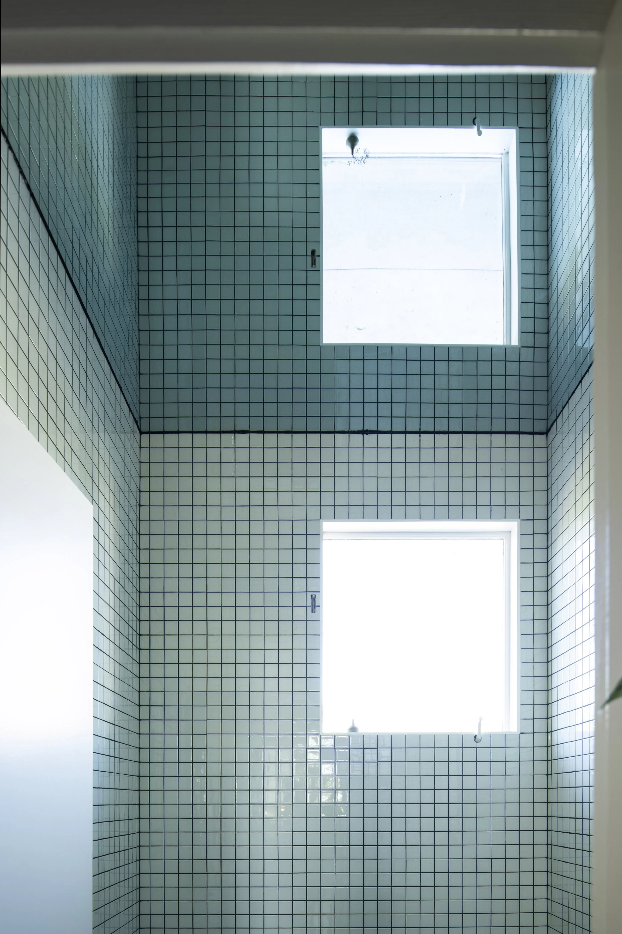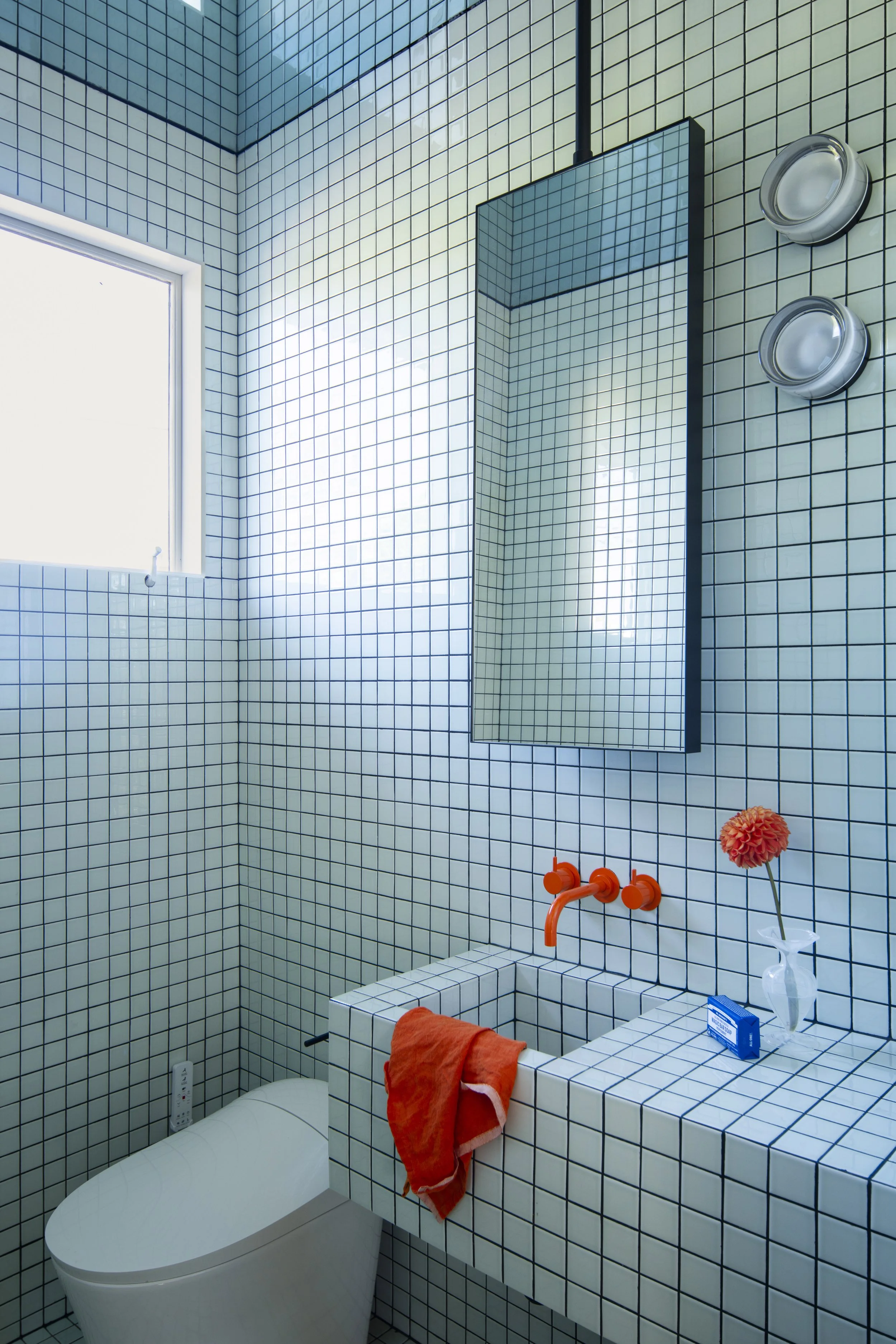A bland powder room is always a missed opportunity. The concept here was really quite simple: imagine you take the whole room and dip it in 2x2 tiles. The walls the floor the counter the sink. And do not cut a single tile. The glossy mint subway tile contrasted with the bright orange faucet was a modern twist on a vintage color pairing. Lastly, the single sheet of mirrored glass on the ceiling adds an element of surprise and optical illusion.