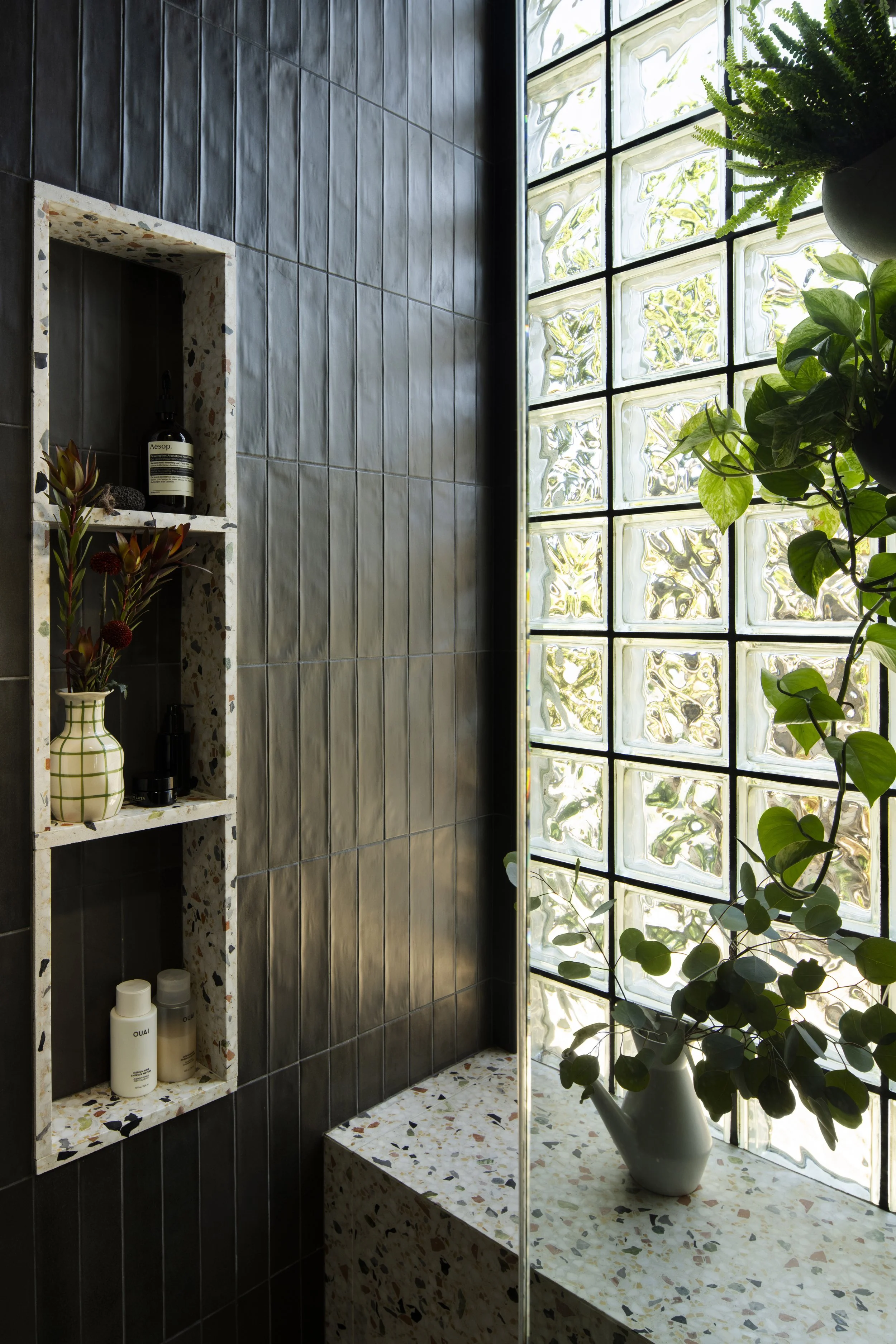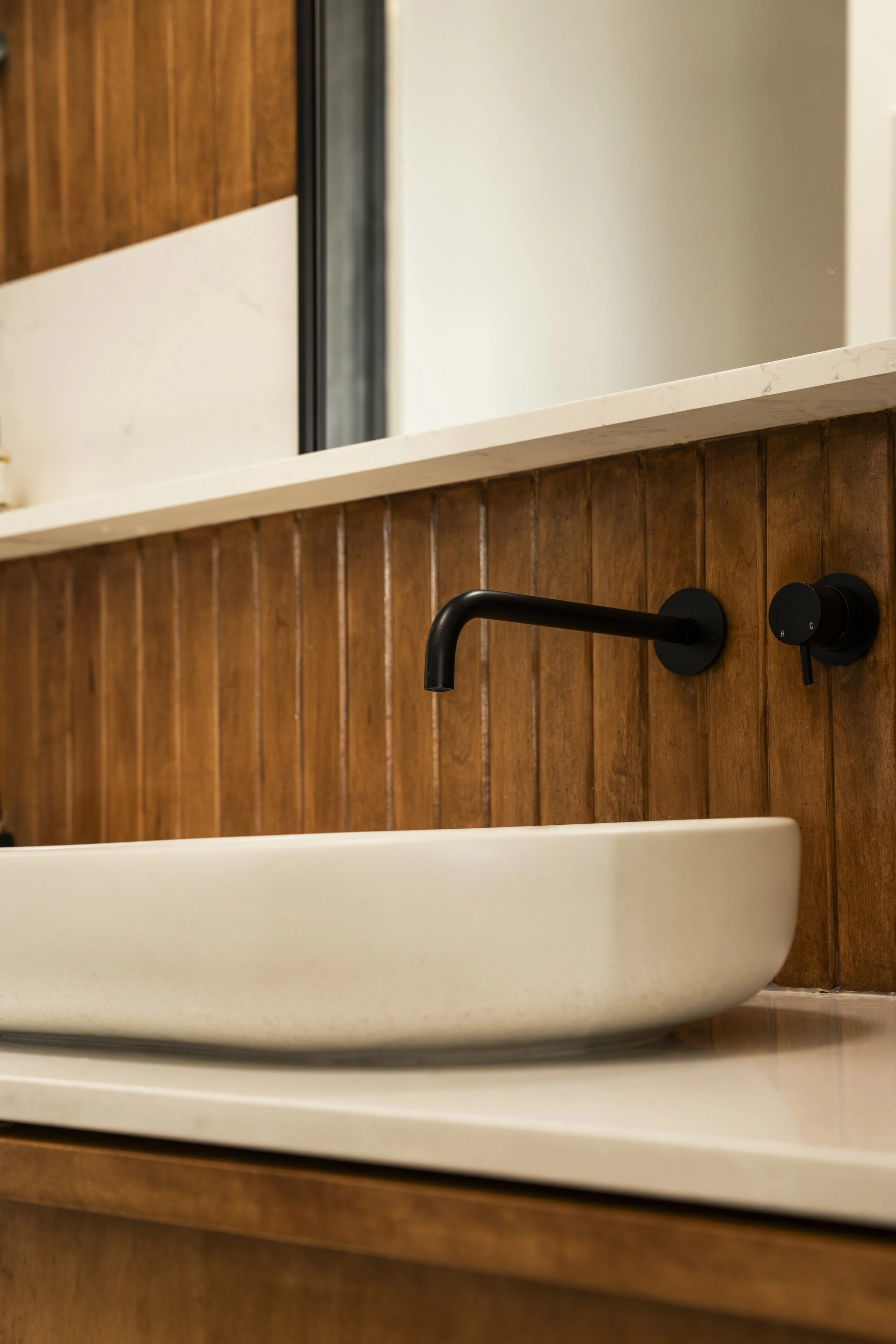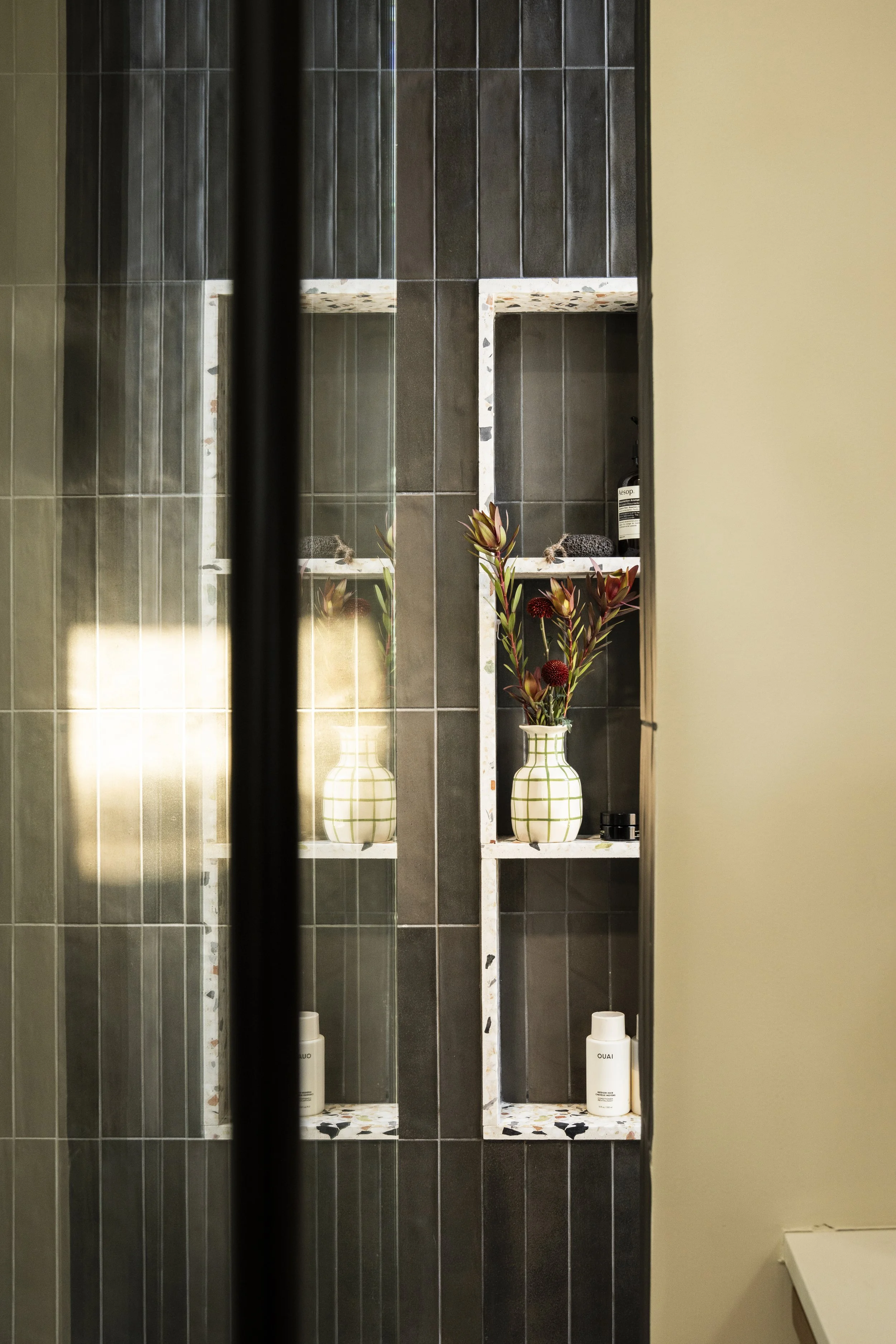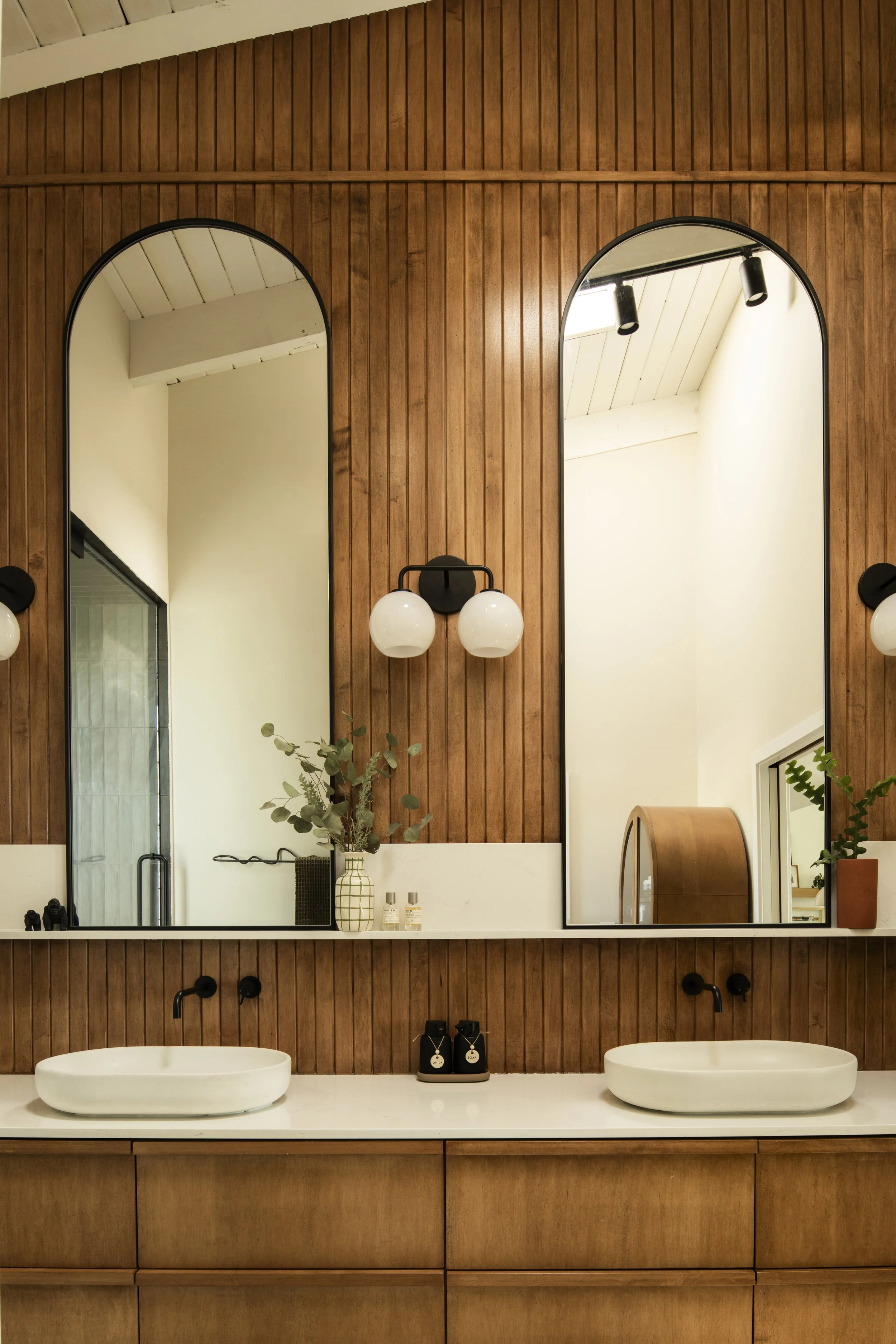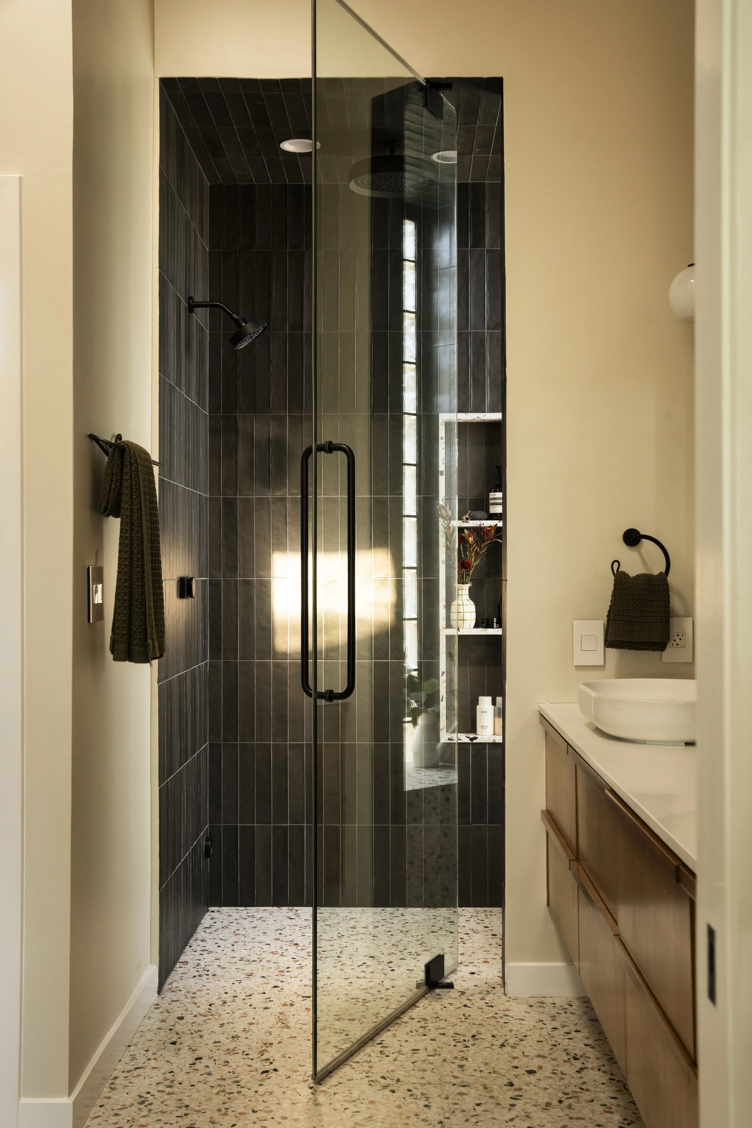 This primary bath was about honoring the mid-century material palette and accentuating the tall ceilings in an otherwise small space. For the vanity wall, custom stained maple tambour paneling and a matching vanity took several tries to get the color just right - the perfect mix and brown and honey tones that fit its vintage inspiration. The vanity was designed to float about the terrazzo floors to make the floor area feel larger, and integrated drawer pulls keep the horizontal lines clean. Shallow concrete vessel sinks sit atop a white quartz counter. Wall-mounted faucets and a cantilevered stone shelf keep the countertop free of clutter white providing functional decorative storage. The globe sconces were the perfect mid-century finishing touch.