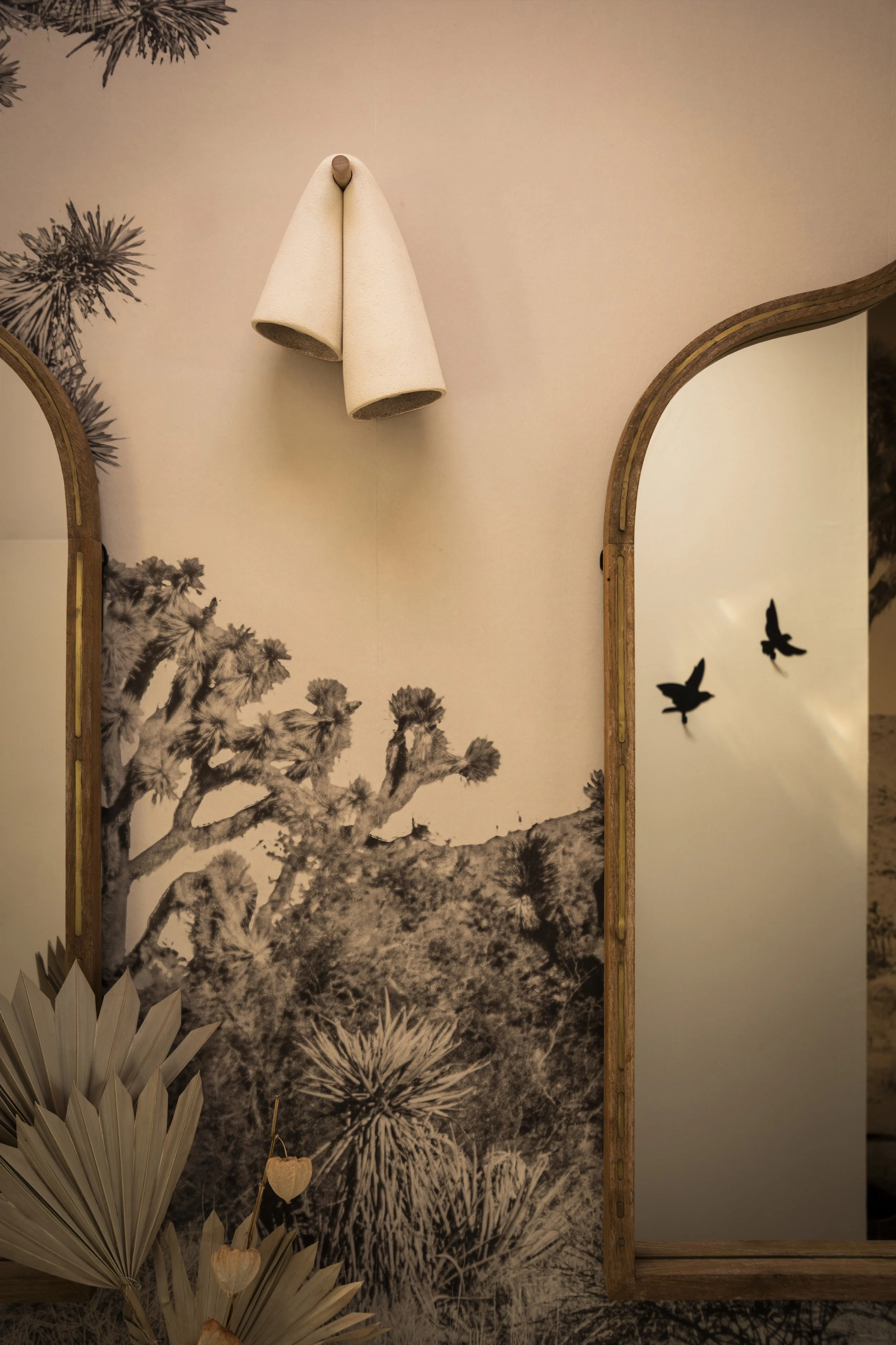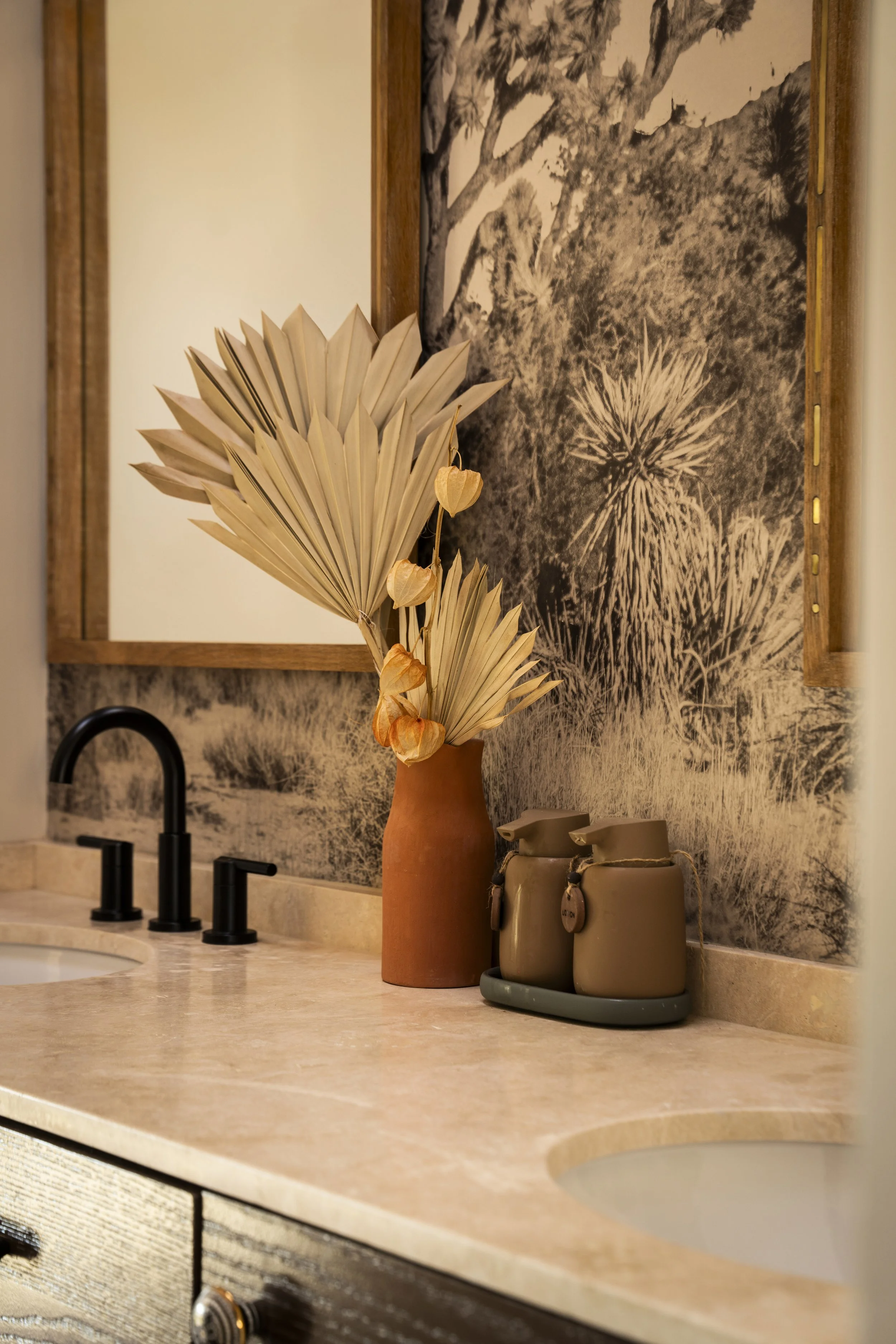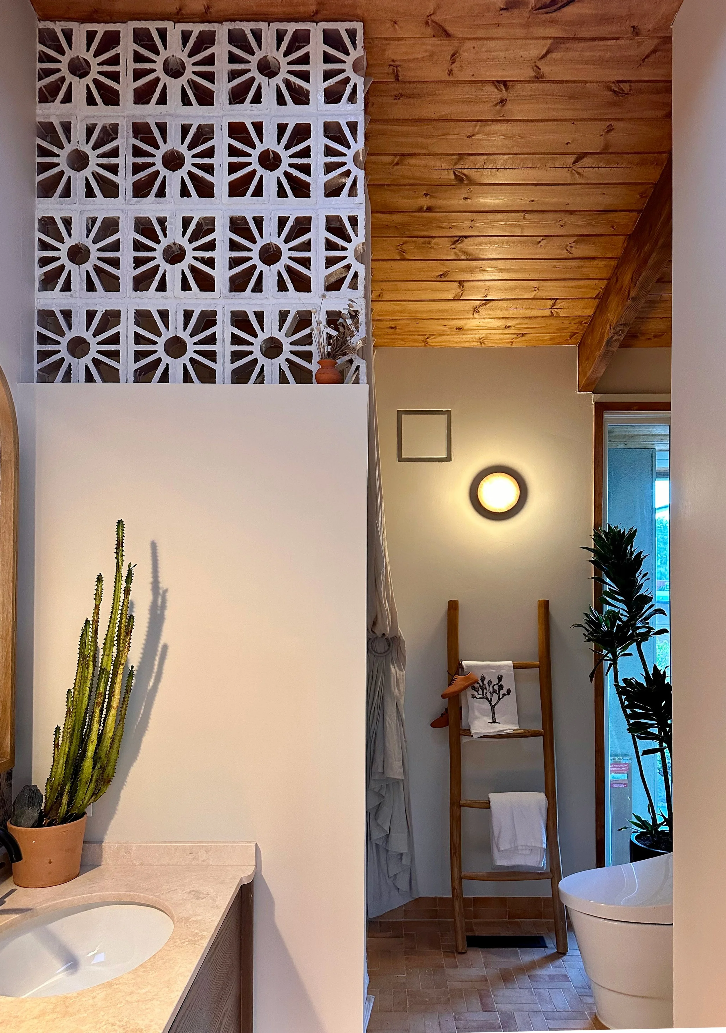 For this guest bathroom, I had warmth and light guide the design, something timeless but not too serious. I needed to function as the kids bathroom, while not feeling overly childish. Inspired by a desert landscape, playful wallpaper is paired with a textured terracotta floor. Zellige tiles in the shower mirror the these of imperfections found in the floor. The breeze blocks allow the light from the skylight to enter the shower and paints the walls with rich shadows. Custom shower drapery make the space feel more luxurious without compromising on the function of the bathtub. Finally, dried florals, a vintage step stool, and hand-painted accent tiles tie the room together.