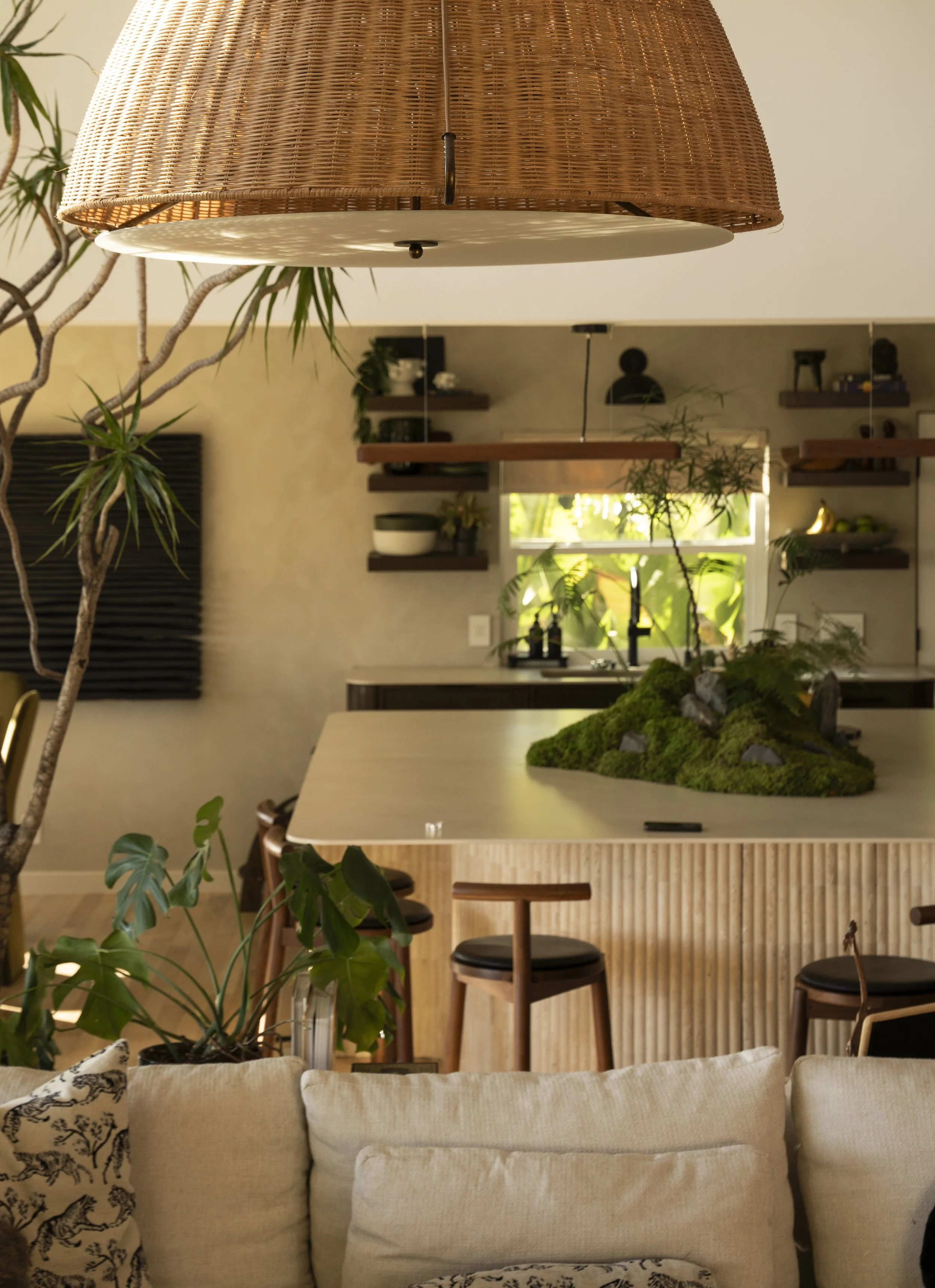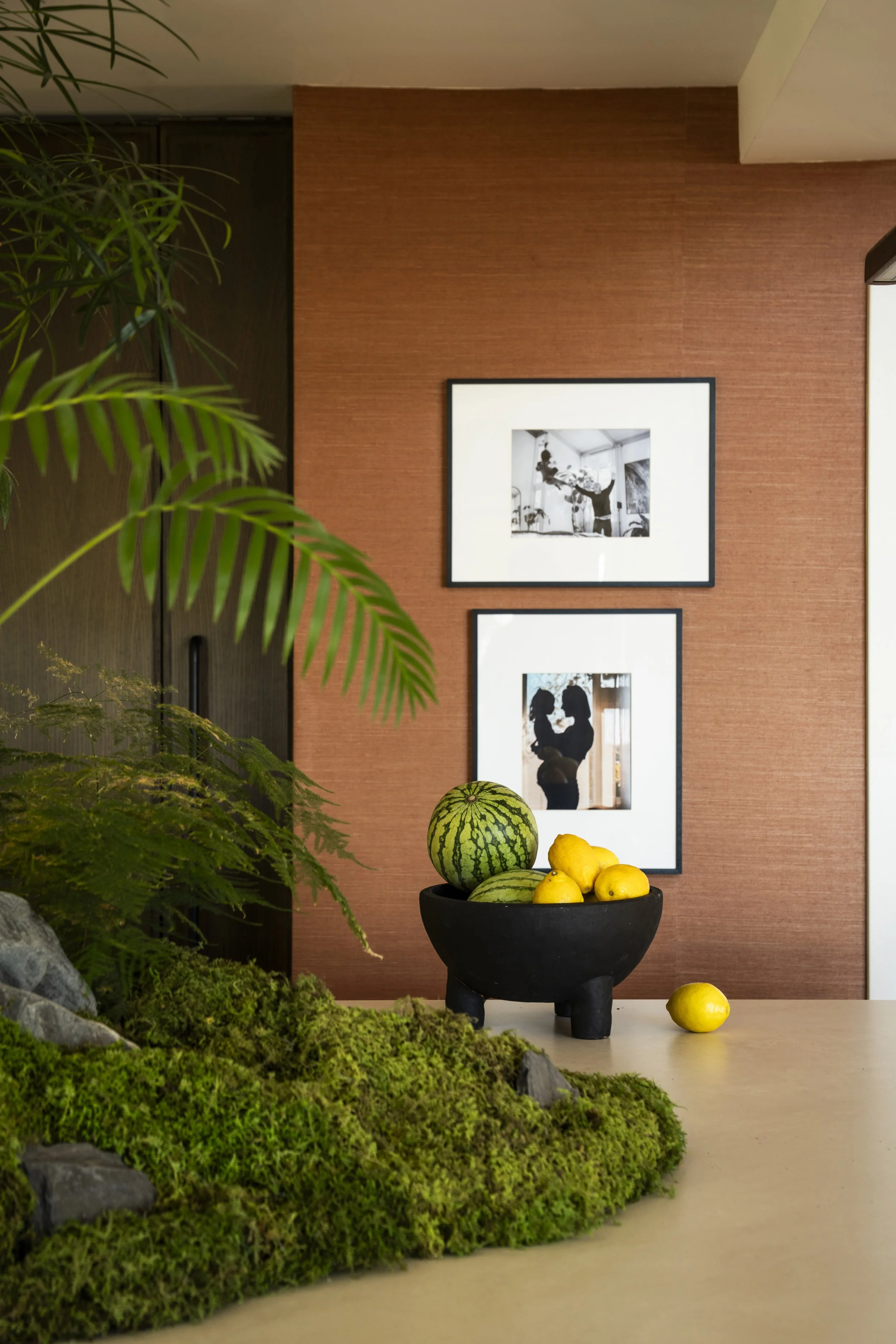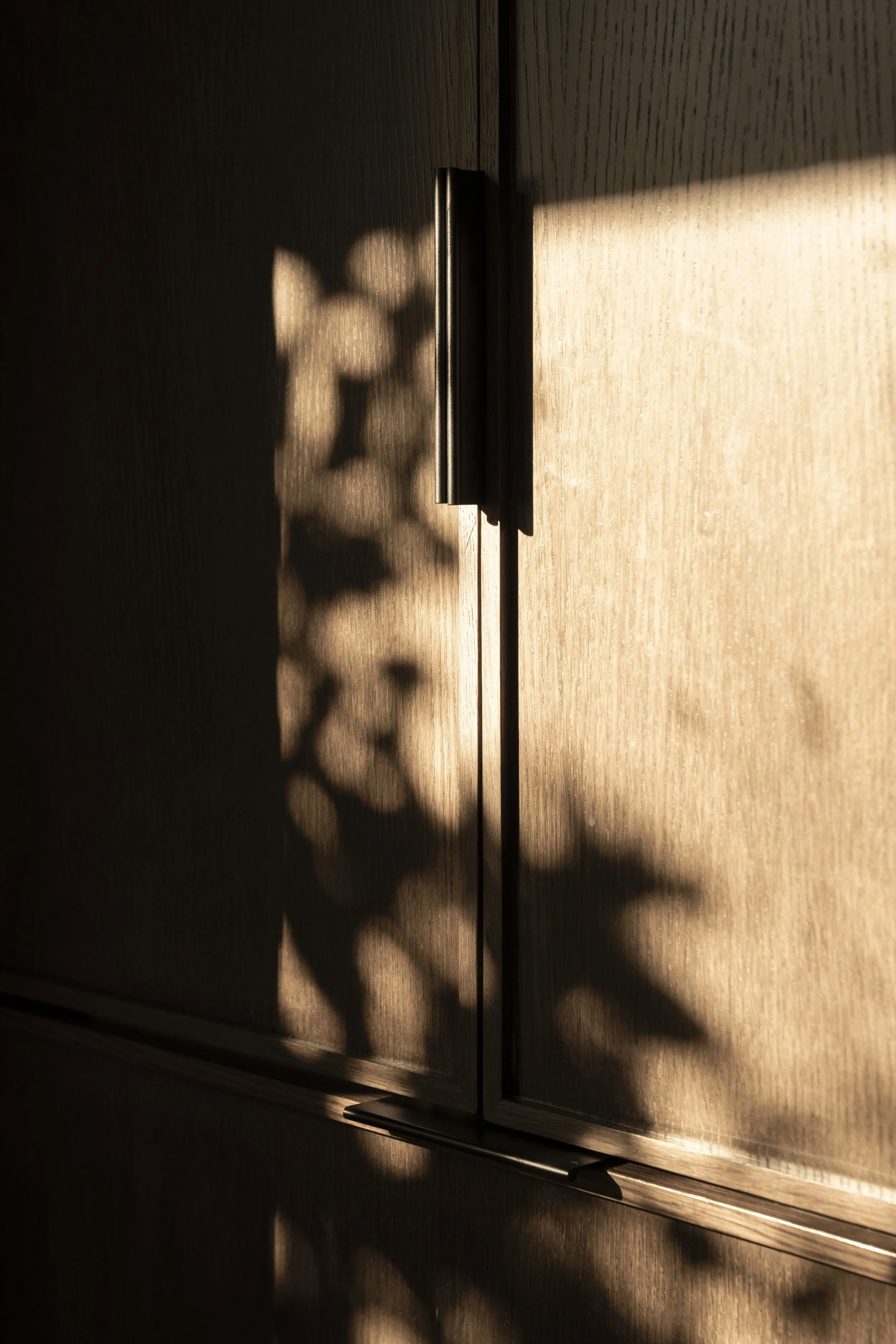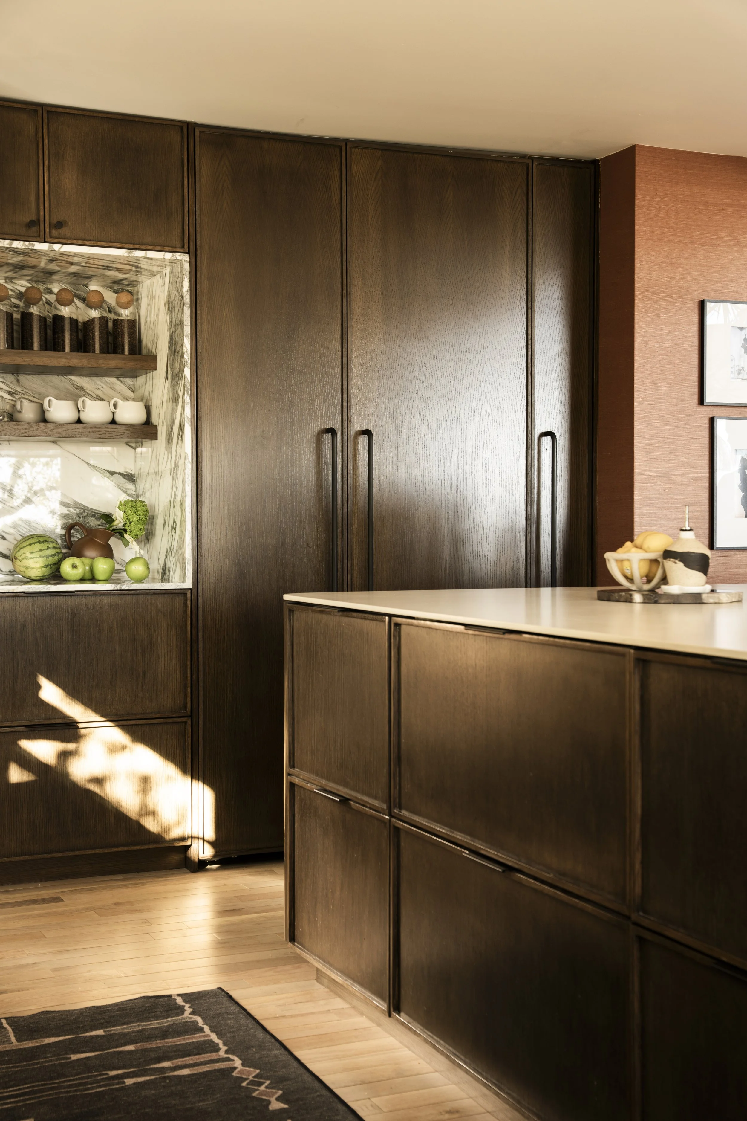 In order to create a more open concept family room, two structural wall were removed to integrate the kitchen into the main living space. The existing solid oak flooring was contrasted by the darker stained and fully custom cabinetry. Symmetry, minimalism, function and warmth were the main design drivers here, with influence from both Scandinavia and Japan in detailing and materials. All appliances are hidden in plain sight to create a clutter-free workspace. The fridge behind full height millwork, the microwave and other secondary appliances behind pocketed doors, and the cook top is invisible induction under the porcelain countertops. Since tea culture is prevalent in the home, a marble clad nook honors the ritual.
